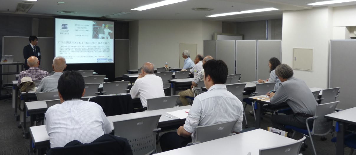 【2018.07.13】市民公開講座No.434 橋の材料と構造を観る Author Masaki YamadaPublished on 2018年7月14日2018年7月24日 7月13日(金),本学一番町ロビーにて,市民公開講座No.434 が開講されました.「橋の材料と構造を観る」と題して,本学科 山田真幸 准教授が登壇しました.橋梁の模型作りから数学を使いながらの橋梁の部材の話,加えてわが国の道路構造物を取り巻く現状や歴史について講義いたしました.会場からは鋭い質問をいただきました.ご参加頂きました皆さま,どうもありがとうございました. 2018 市民公開講座